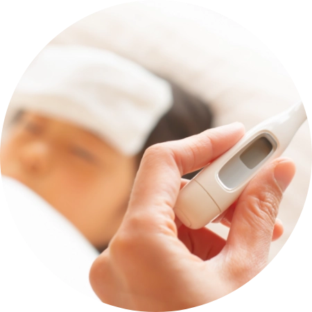 乳幼児の発熱は「37.5℃以上」がひとつの⽬安です。発熱の主な原因は感染症であり、多くがウイルス感染によるものです。発熱以外にも、のどの痛み、頭痛、⿐汁、咳、吐き気や下痢などが表れる場合があります。また、発熱を繰り返したり、⾼熱が続いたりしている場合は、感染症以外の原因も考慮しなければなりません。