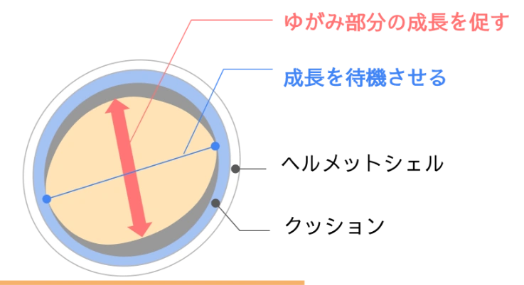 ヘルメットを装着することで、図のようにゆがみ部分に空間をつくり成長を促進させます。 ※歯科矯正と異なり力を加えて変形させるわけではありません。